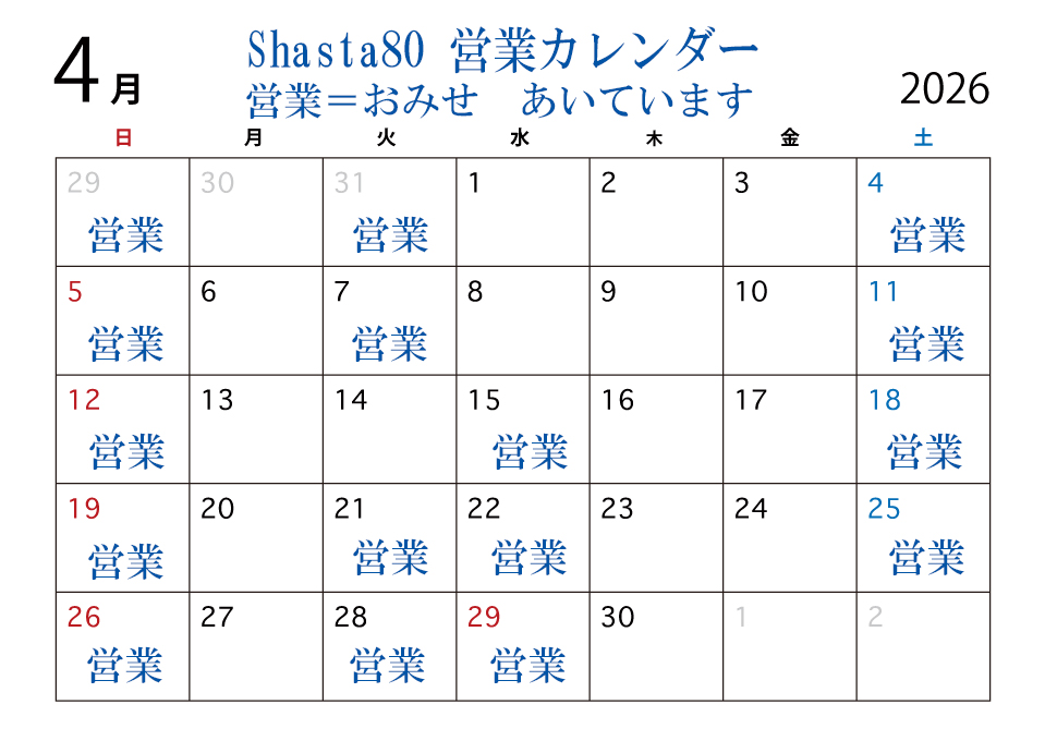 4月の営業日カレンダーです。 どうぞよろしくお願い申し上げます。
